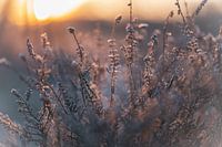 close up van een heideplant in rust, waar de ochtendnevel tussen hangt, en de zon opkomt in de achtergrond