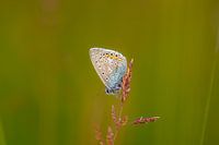 close up van een heideblauwtje met groen - oranje achtergrond