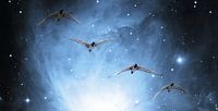 vliegende heilige ibissen in de nachtelijke hemel gemengde techniek
