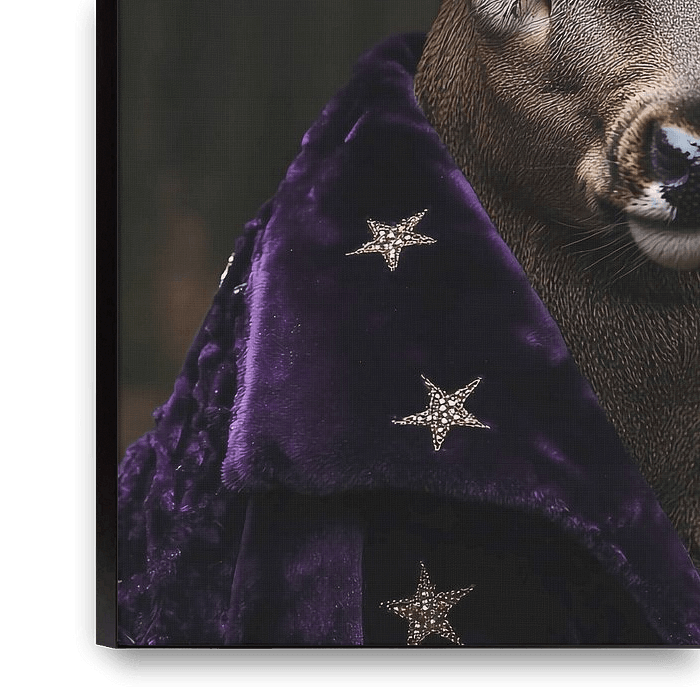 Mooi hert in een paars fluwelen heksenkostuum in het bos