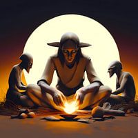 In dit fascinerende kunstwerk is in het midden een mysterieuze figuur afgebeeld die in kleermakerszit zit en wordt geflankeerd door twee andere raadselachtige figuren; ze zijn allemaal verzameld rond een eeuwenoude schaal die oplicht in het schijnsel van het vuur. De warme sfeer wordt benadrukt door een achtergrond die doet denken aan…
