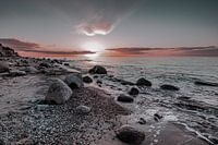 Aan de klifkust van Heiligenhafen zakt de zon net in de zee. Grillige blokken op het strand in het grind en zand, worden keer op keer weggespoeld door de branding van de Oostzee. Het kabbelen van de golven is als muziek in de oren.
