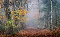 herfst in het Ulvenhouts bos. Een mistige ochtend, een bruin bladerdek op de grond. Nog groengele bladeren aan de bomen. Het opkomende ochtendlicht . het geheel creëert een rustiek beeld.