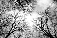donkere silhouetten van boomtakken afgetekend tegen hemel met wolken in herfst in zwartwit