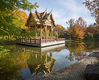 herfstachtig parklandschap München Westpark, vijver met Thaise tempel, omringd door kleurrijke bomen. waterreflectie