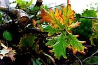 Een mooie herfstkleur heeft dit blad. Opgefrist na de regen glanst het je tegemoet. Het groen oranje en bruin springt eruit.