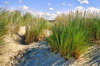 Een beeld van het helmras in bloei in het duinlandschap. Zonlicht en schaduw bedekken het helmgras. Helmgras een belangrijke plant voor behoud van het duinlandschap.