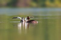 een jong fuutkuiken doet de eerste vluchtpogingen op een vijver