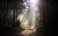 Een wandelpad in de prachtige natuur van de Veluwezoom. Het pad word verlicht door neerdalende zonneharpen en geeft een magisch doorkijkje in het bos.