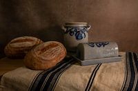 ambachtelijk brood gebakken meel kan blauw stilleven botervloot porselein antiek ouderwets achtergrond meelzak doek Canvas wit blauw stenen voedsel eten gezond speltbrood meel