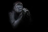 Geërgerd denken met gevouwen handen onder de kin van een sterke mannelijke gorilla, portret close-upMichael Semenov Het machtige luipaard gaat recht naar u kijken verticale samenstelling, Zwarte achtergrondMichael Semenov