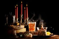 hete thee met spetter en stoom, kaarsen en snoepjes maken het donkere winterse leven gezellig, rustiek stilleven tegen een zwarte achtergrond met kopieerruimte, selectieve focus
