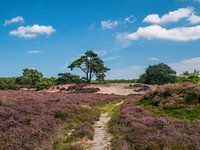 een foto met een blauwe lucht en witte wolkjes en mooie heide velden dat is voor mij typische Holland