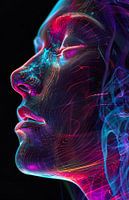 Een betoverende holografische afbeelding onthult een prachtige röntgenfoto van een gezicht met iriserende kleuren. De transparantie onthult fosforescerende architectonische structuren, die een intrigerende synthese van wetenschap en kunst creëren. Het beeld belicht de verweving van anatomie en esthetiek, waarbij de fosforescerende details een buitengewoon visueel schouwspel van transparante schoonheid creëren.