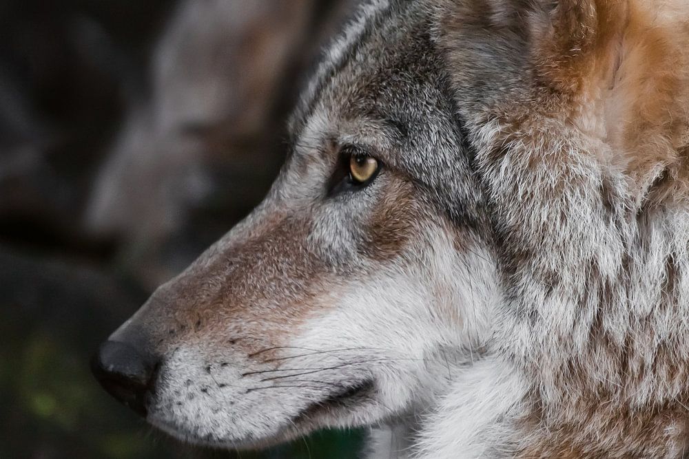 hoofd in profiel. she-wolf vrouwtje ligt mooi op de grond, imposante leugens. Krachtig sierlijk dier in het bos in de herfst,