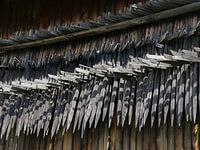 op de Oostenrijkse almen gebruikte steunen om het hooi op te drogen, hier Ladis Tirol. Vaak zie je ze ook tegen de hutjes hangen zoals hier op de foto.