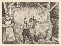 In de hooistal staan een boeren dochter, een boer en een werkpaard bij een berg hooi als voorbereiding voor de winter. Een agrarisch beeld van een familie boeren met hun schuur.