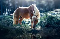 Een sprookjesachtig beeld van een haflinger pony tussen de varens die kijkt naar de weerspiegeling in het water. De kleuren zijn zacht en dromerig maar toch ook duidelijk aanwezig.