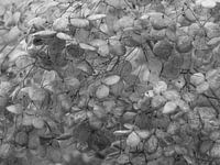 Zwartwit macro van een halfvergane Hortensia (Hydrangea) ,met bijna transparante blaadjes. waarin elk detail zichtbaar is.