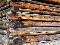 balken van een oud verweerd houten hooi hutje op de alm in Tirol Oostenrijk
