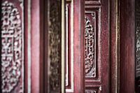 Rij mooi bewerkte houten deuren bij tempel in Hue