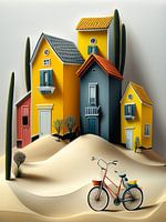Deze foto lijkt een mengeling van een mediterrane droom en een surrealistische speelgoedwereld. Kleurrijke, geometrisch vereenvoudigde huizen met felle kleuren staan op zachte, zandachtige heuvels alsof ze van papier of klei zijn geboetseerd. Het landschap is bijna magisch stil, minimalistisch maar vol charme. Een nostalgische fiets op de voorgrond lijkt een verlaten overblijfsel van een zomerse kindertijd - klaar om in beweging te komen zodra je kijkt. De foto speelt op een speelse manier met ruimte, vorm en herinnering.