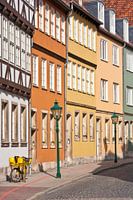 Historische huizen en een postkantoorfiets in de oude stad van Hannover.