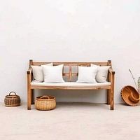 Rustig minimalisme zen Ibiza stijl beeld van een houten verweerde tuinbank staand op het zand met rieten manden ernaast tegen een witte kalk muur.