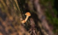 close up van een super klein paddenstoeltje dat uit de boomschors van een grote boom groeit, met donkere achtergrond