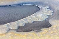 IJsformaties door de wind opgestuwd. Zonlicht en blauwe lucht geven deze foto kleur.