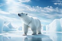 Afbeelding van een ijsbeer op een ijsschots. Blauwe deels bewolkte lucht in de achtergrond. Koude sfeer.