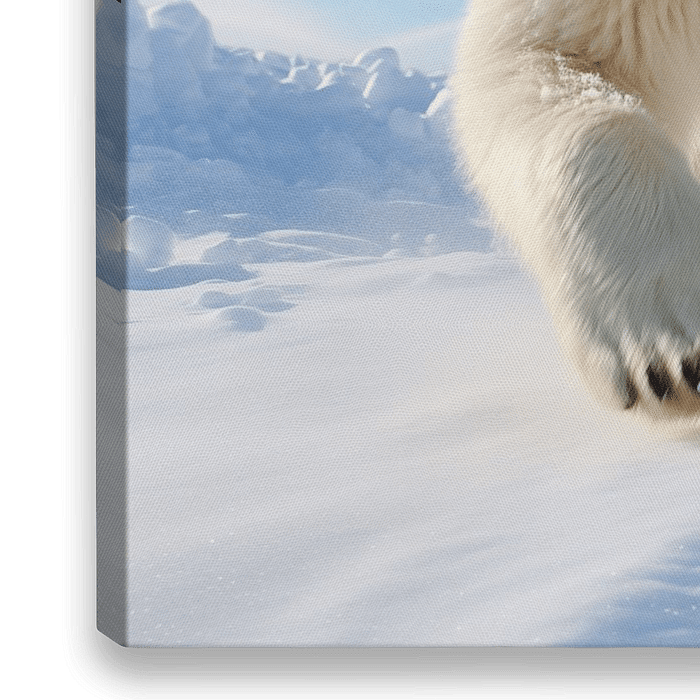Afbeelding van een ijsbeer die naar je toe rent door de sneeuw, de achtergrond is een helderblauwe lucht.