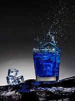in een blauw glas heb ik ijsblokje gegooid. Er liggen 3 gestapelde ijsblokjes naast het glas. Veel spetterend druppels boven het glas.