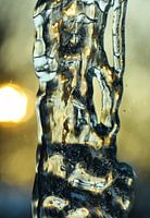 Ijspegel tegen het raam met opkomende zon op achtergrond, zo wordt het bijna natuurlijke kunst.