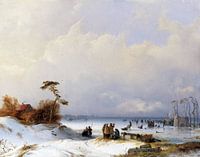 Op het water ligt ijs en deze mensen hebben veel plezier in de winter met slee en schaatsen. Mannen, vrouwen en kinderen hebben pret aan de kant en op het meer. Op de achtergrond de skyline van een stad in dit landschap.