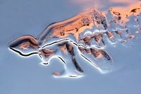De dooi is ingetreden. De laatste ijsschotsen drijven op het water. Wolken die door de late zon rood kleuren weerspiegelen in de ijsschots. Toen ik langs deze waterpartij liep viel mij in eerste instantie deze kleine ijsschots niet op. Toen ik wat verder liep kwam plotseling de weerschijn van de wolken en de ondergaande zon tevoorschijn.
