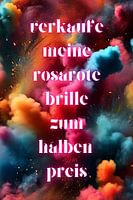 Onze fine art print met de humoristische zin "Sell my rose-coloured glasses for half price" is omgetoverd tot een uniek kunstwerk met een levendige explosie van kleur op de achtergrond. Deze afbeelding is perfect voor Valentijnsdag en geeft een speels tintje aan je kamers.