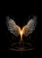 Levensgrote engelen vleugels voor een donkere muur. Door het goudkleurige vuur krijgt het beeld een mysterieus en gevaarlijke uitstraling. Het beeld kan tevens als digitale achtergrond gebruikt worden