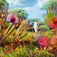In dit betoverende kunstwerk belandt Mata Hari in een wereld die rechtstreeks uit een sciencefictionfilm lijkt te komen. Ze verschijnt als een mystieke figuur met elfenvleugels, gehuld in een zachte roze jurk, zwevend in een exotisch landschap vol weelderige vegetatie en buitenaardse kleuren. Het beeld roept een sfeer op die balanceert tussen sprookje en toekomstvisioen.