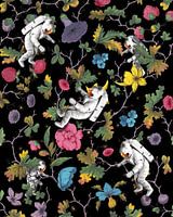 Dit is een vrolijke en kleurrijke collage van diverse illustraties van bloemen, sterren en ruimtevaarders, op een met fonkelende sterren bezaaide zwarte achtergrond.