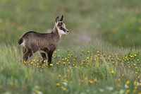 Gems / Gaemse ( Rupicapra rupicapra ), schattig reekalfje, jong babydier, staande in een bloeiende alpenweide, kijkend naar zijn ouders, Europa.