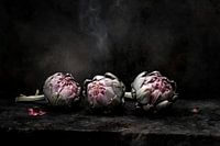 Een intens en sfeervol stilleven waarin drie artisjokken liggen als gesloten bloemen, badend in mysterieus licht. Hun paarse harten glanzen subtiel in het halfduister, terwijl een flinterdunne nevel van stoom of rook zacht over het beeld zweeft. De ruwe ondergrond en de dramatische achtergrond versterken het gevoel van stilte, concentratie en tactiele schoonheid. Deze compositie heeft een bijna rituele kracht — alsof de groente een geheim draagt. Een werk vol textuur, diepte en emotie, perfect voor keukens, eetruimtes of kunstliefhebbers met een oog voor het onverwachte.