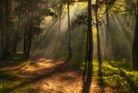 Landschap. Zonnig weer. Het bos wordt doorboord door de stralen van de zon.