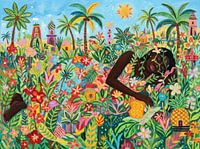 Dit levendige kunstwerk, met de titel "in the Dream Garden", is een viering van kleur, natuur en innerlijke rust, geïnspireerd door de weelderige schoonheid van tropische landschappen.