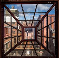 dit raam staat op de plaats waar ooit een spoor liep nog naar het ander gebouw .dit geeft het raamwerk ook terug weer met zijn vorm