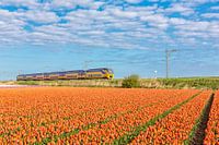de intercity van de NS rijd op het spoor langs de uitgestrekte bloembollenvelden.