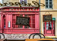 Blik op een fraai roze restaurant door het raam van een ander restaurant in Bayeux- Frankrijk