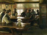 In deze bistro, dit restaurant, eetcafé of eetgelegenheid zit een aantal mannen. Sommige heren druk in gesprek, maar de voorste kerel zit met zijn pijp en borrel rustig te genieten van zijn drankje naast zijn fles sterke alcoholische drank. Hier mocht roken nog in een café.