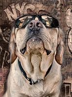 Portret van een Labrador hond met een zonnebril en kijken en reflectie wolkenkrabber in de lenzen met behulp van een New York Graffiti texture.