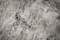 Het is het einde van de zomer in zuid Afrika en dat kun je goed zien, het gras is hoog, de zon staat laag en er hangt een warme gloed over het landschap. Jakhals gefotografeerd in het Kruger park met 400 mm en licht sepia uitgevoerd.